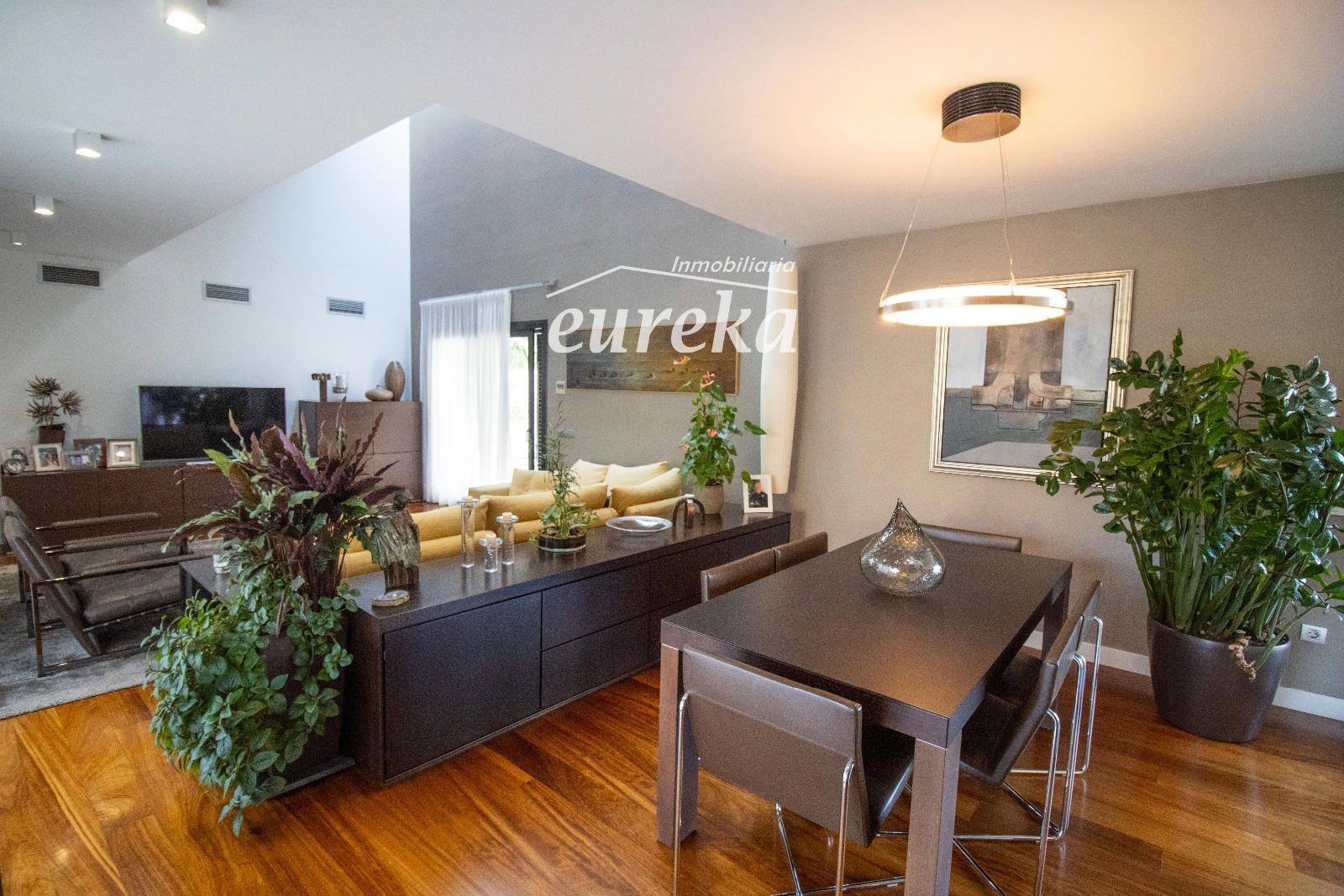 Le séjour-salle à manger est tout simplement spectaculaire, avec ses hauts plafonds et ses grandes fenêtres qui amplifient la sensation d'espace et s'ouvrent sur la terrasse et la piscine.